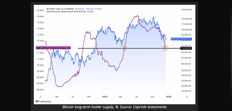 Long-term holder behavior — selling rallies, buying dips — is a key directional signal.