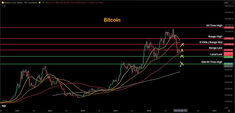 Even corporate accumulation from firms like MicroStrategy appears insufficient to create a sustainable floor, though it may help define a local bottom near the 200-week EMA.