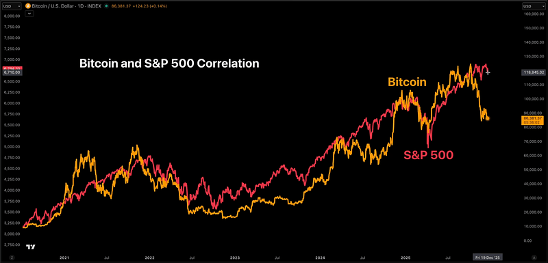 Globally, the S&P 500 remains in consolidation. If it can resume an uptrend, it would provide the macro lift needed for a Bitcoin relief rally. Meanwhile, gold continues to push upward, reinforcing the ongoing fiat debasement trade.
