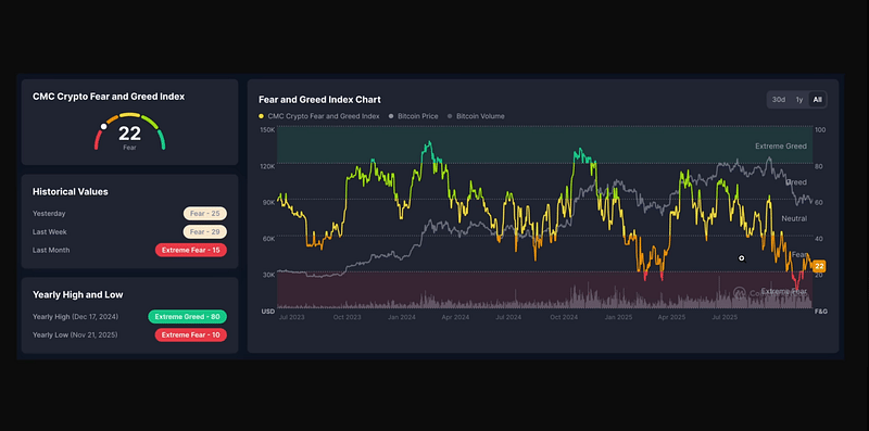 The Fear and Greed Index sits at 22, a level associated with high anxiety, forced selling, and an elevated risk of capitulation if prices weaken further.