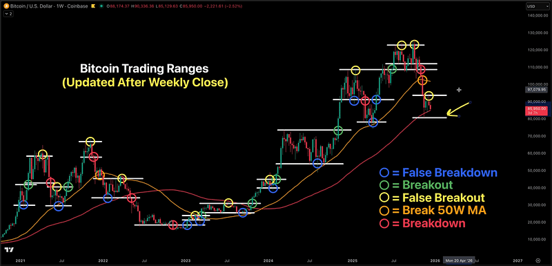 The immediate picture is one of consolidation inside a weekly candle range between roughly $81K and $91K.