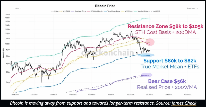 Support sits near the low $80Ks. Resistance lives in the mid-$90Ks.