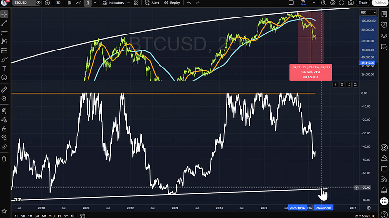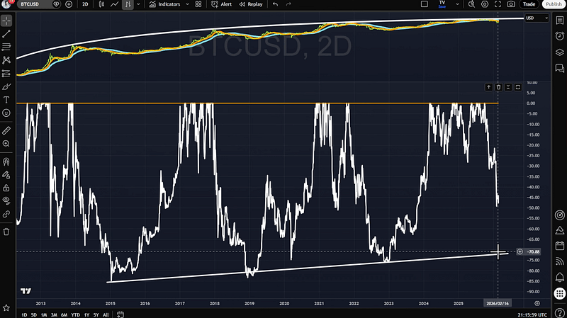 The 200-week moving average — which used to be the ultimate “never break” support — was already violated in 2023. That alone tells me we’re not in a textbook bull continuation phase.