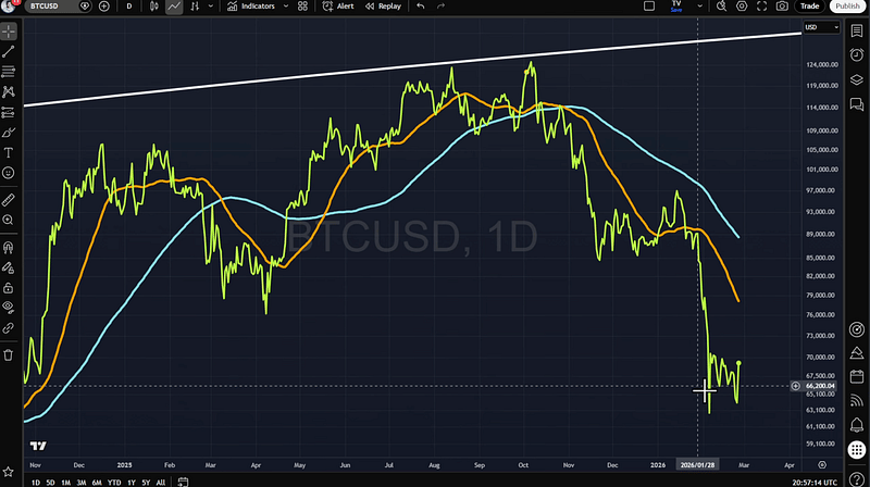 Bitcoin is still trading below its 44-day simple moving average — sitting around $78,000 — and below its 125-day average as well.