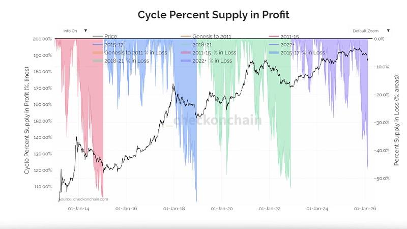 Another datapoint I can’t ignore is supply in profit. In deep bear markets, this metric collapses. Most holders are underwater. That’s when bottoms form.