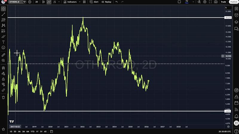 There’s a metric called Others Dominance — altcoins outside the top 10. Over the long term, this has settled into an equilibrium around ~9.75%.