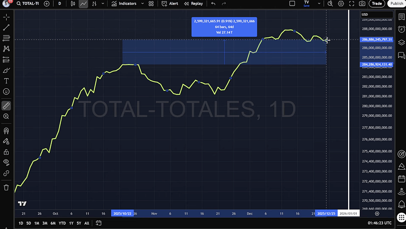 A relatively small amount of capital rotating from stablecoins into BTC and ETH can dramatically increase total market capitalization.