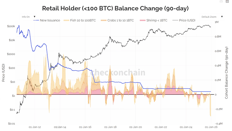 Small wallets — the so-called “shrimps” holding less than 1 BTC — barely matter in the grand scheme of price discovery. They buy dips. They rarely take profits properly. They are emotional, but their capital base is too small to move the market meaningfully.